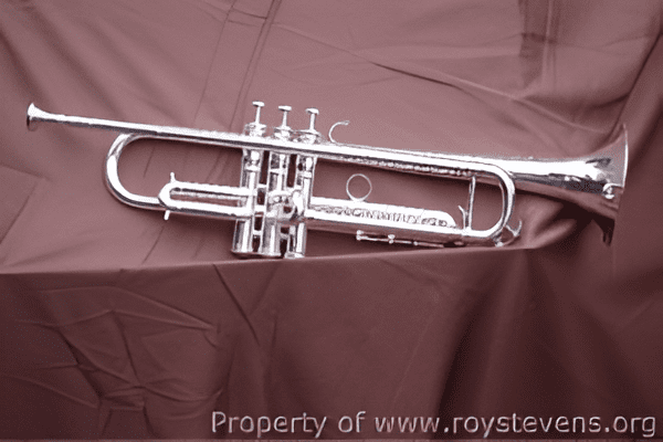 Roy played a few trumpets during his career. Early in his career he played an Olds Super model trumpet. In the 40’s through the part of the 60’s Roy played and endorsed the Selmer (Paris) K Modifed model. There are some Selmer ads with him in the Writings section of this site. After Selmer, for a short time Roy endorsed a Calicchio model that was a ML bore with a 1S bell and 3 leadpipe and the Holton ST-100 which was later known as the Dave Stahl model. After these endorsements and until his death, he played a Paris made French Besson Brevete (pics below). He also owned a Meha which he seldom used. Roy used the Brevete on all of the demo audio recordings on this site. He felt the silver plated Brevete projected well yet maintained its warmth and character.